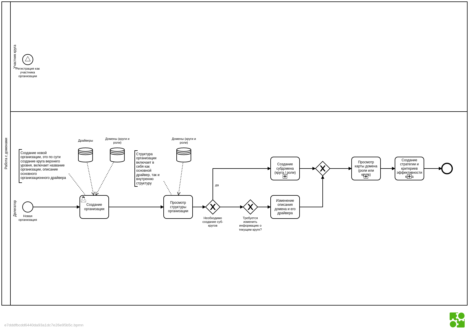 Карта доменов включает в себя схематичное изображение доменов: кругов и ролей, типы доменов: открытые или закрытые, делегируемые и вакантные домены (зоны влияния), а также различные связи между доменами (делегирование, представительство и другие).